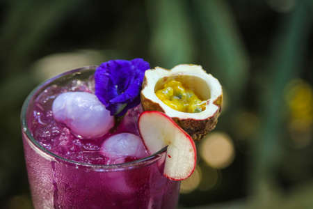 A glass of Butterfly Pea and lemon juice with fresh fruit.
