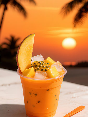 Passion fruit smoothie in plastic cup on table with palm tree and sunset