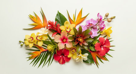 A vibrant arrangement of exotic tropical flowers including strelitzia, hibiscus, orchids, and anthurium with lush green leaves on a clean white...