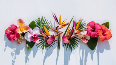 A vibrant flatlay showcasing tropical flowers like hibiscus, orchids, and bird of paradise, arranged aesthetically on a white background with their shadows cast.