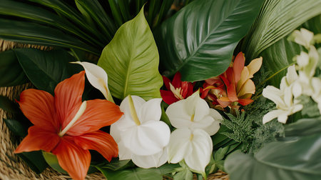 A stunning collection of lush green tropical leaves interspersed with vibrant red and white flowers creates a captivating natural backdrop, perfect for nature-themed projects.