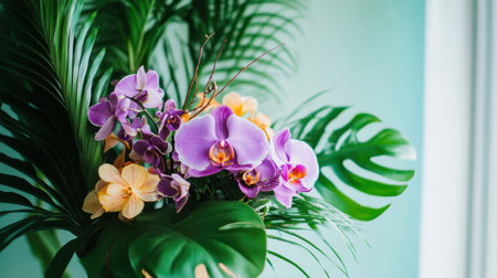 A botanical arrangement featuring a bouquet of exotic orchids and monstera leaves.