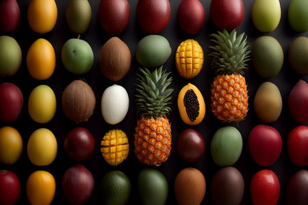 A vibrant display of tropical fruits featuring pineapples, papayas, and mangoes on a dark stone background, perfect for promoting a healthy lifestyle and culinary inspirations.