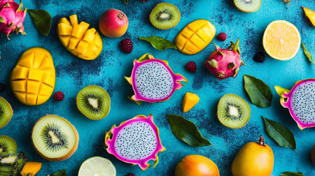 Various vibrant tropical fruits are sliced and artfully arranged on a clear surface, showcasing a rainbow of natural colors and textures. the assortment includes dragon fruit, kiwi, papaya, mango, lemon, orange, and grapefruit, emphasizing freshness and variety. Generative AI