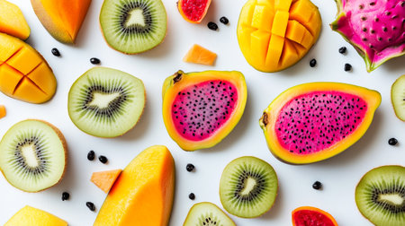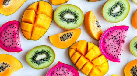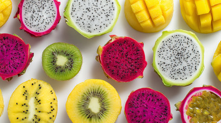 Colorful combination of sliced tropical fruits placed flat on a white surface