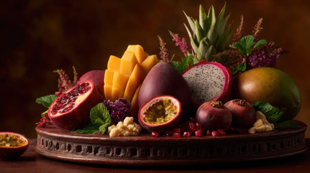 A stunning display of exotic fruits arranged on a wooden platter, complemented by fresh herbs. This image captures vibrant colors and textures, ideal for food enthusiasts.