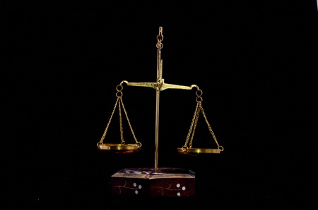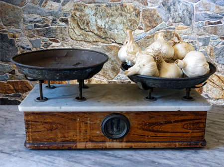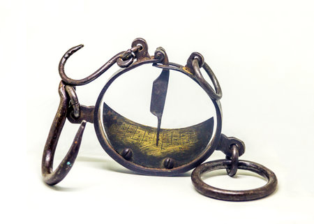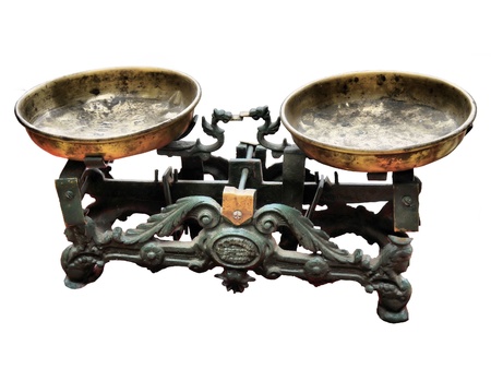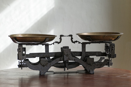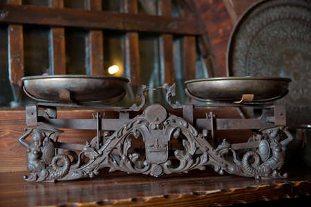 old fashioned retro metallized heavy antique iron balance scales tool for measuring weight with decorative steel design on wooden or wood table