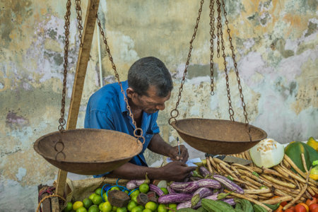 GALLE, SRI LANKA - February, 14, 2016: Street vendor with vegetables and vintage scales