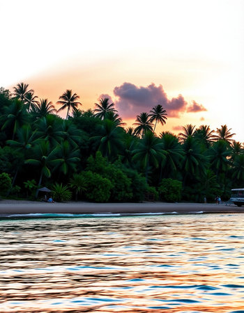 Serene sunset over tropical lagoon with boat and palms