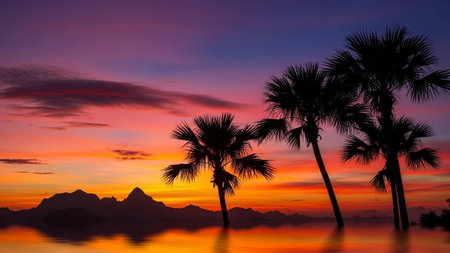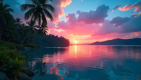 Tropical sunset reflecting on calm water with palm trees