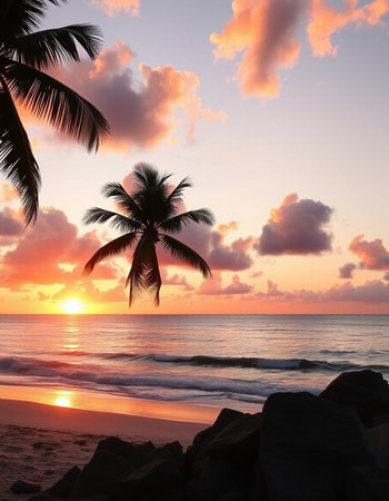beautiful sunset on the beach with palm trees in the foreground.