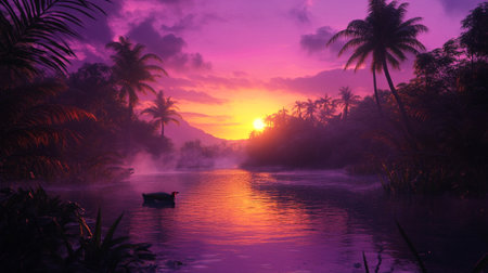 Tropical lake sunset with palm trees and colorful clouds