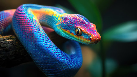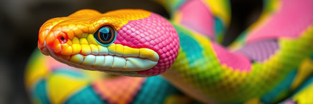 a vibrant, rainbowcore snake with light crimson and violet hues is captured in this photo. the photorealistic detailing and photo-realistic techniques bring out the strong facial expression of the snake. shot on 70mm, this image showcases the snake's colorful beauty in a mesmerizing way. ai generated