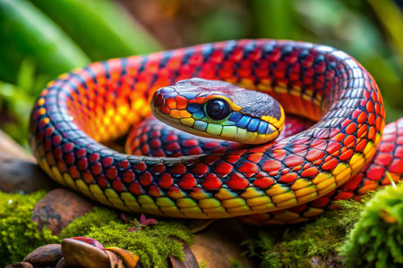 Colorful snake displaying vibrant scales in a lush environment while resting during daylight hours