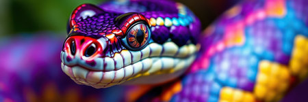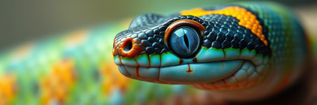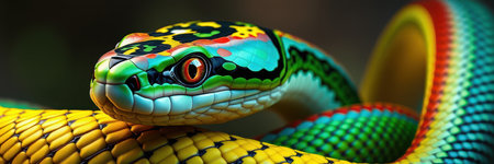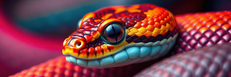 Magnificent Closeup of a Vibrantly Colored Snake Head with Striking Red Eyes on a Dark Background