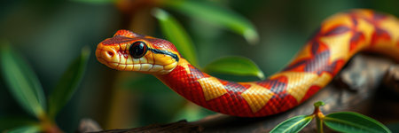 Colorful snake displays vibrant scales in lush tropical environment during daylight hours