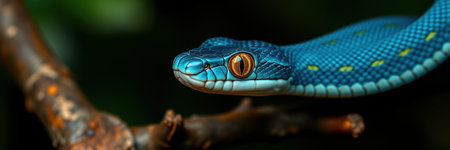 Close-up of a blue snake on a dark background with leaves, Blue pit viper from indonesia, AI Generated