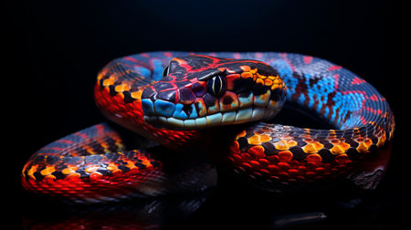 a colorful snake with a blue body slithers gracefully in the background. the dark crimson and orange hues create a visually striking and photorealistic image. the softbox lighting enhances the realistic animal portrait, capturing the snake's intricate patterns. this captivating photograph, taken with a voigtlander bessa r2m, showcases the beauty and detail of nature's creatures. ai generated