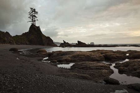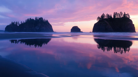 A stunning view of a rocky beach at sunset, featuring tall trees and majestic formations, casting beautiful reflections in the gentle ocean waves. Ideal for nature enthusiasts.