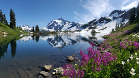 An idyllic image suitable for travel guides, environmental conservation campaigns, or as a breathtaking backdrop for meditation and wellness spaces | This picture unfolds a serene alpine setting where a crystal-clear lake reflects a majestic mountain peak and a blue sky scattered with fluffy clouds. The verdant slopes dotted with evergreens highlight the robust life and unspoiled beauty of high-altitude ecosystems. In the forefront, a vibrant tapestry of wildflowers in full bloom—dabs of yellow, red, and purple—creates a natural mosaic that celebrates biodiversity and the fleeting splendor of seasonal changes. The mirror-like water captures the dual essence of sky and earth, creating a visual bridge that unites the elements in tranquil harmony. Sunlight filters through the scene with a soft glow, accentuating textures and colors, and instilling a sense of peace and timelessness representative of such pristine wilderness areas | Ideal for use in environmental publications to illustrate the biodiversity of mountain habitats, as part of a collection in nature photography exhibitions, or to set a calming mood in health and wellness settings. It can also serve as an inspiring visual for articles on outdoor recreation or as part of a marketing campaign for eco-friendly travel destinations | a pristine landscape photograph featuring an alpine lake, wildflowers, mountain scenery, and forested slopes, encapsulated under bright daylight which highlights the natural beauty and vivid colors of the flora and landscape, with plenty of room for text or design elements