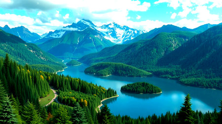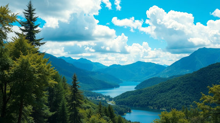 This stunning image captures a tranquil mountain lake surrounded by lush greenery and majestic mountains, reflecting a picturesque sky filled with clouds.
