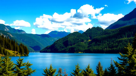 A captivating view of a tranquil lake reflecting a majestic mountain, surrounded by dense evergreen trees under a bright sky. Ideal for nature lovers.