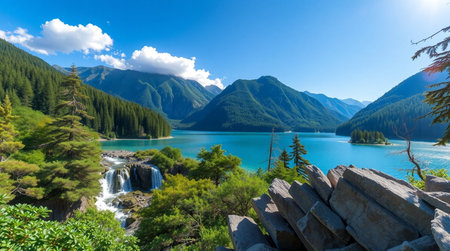 A tranquil landscape depicts a mountain lake with clear water reflecting the surrounding environment. Towering mountains, covered in evergreen trees, frame the scene. The image showcases a natural outdoor setting, with sunlight illuminating the terrain. Suitable for various commercial and editorial applications, this image evokes a sense of peace.