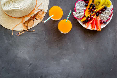 Tropical fruits breakfast on vacation. Fruits with fresh juice and hat, top view