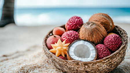 A vibrant basket filled with exotic fruits set against a tranquil beach backdrop, showcasing the beauty of nature and celebrating a healthy lifestyle.