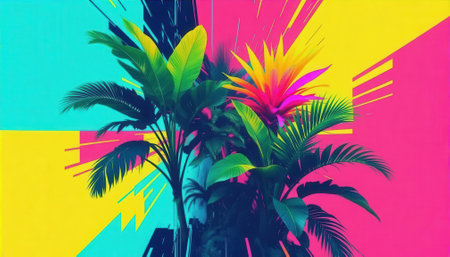 Lush tropical plants stand out against a colorful abstract backdrop, showing a vibrant mix of greens, pinks, and blues, creating a lively indoor atmosphere filled with energy.