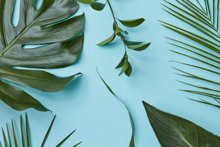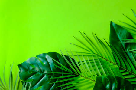 Nature background with green tropical palm leaves. Summer forest or jungle pattern. Flat lat.