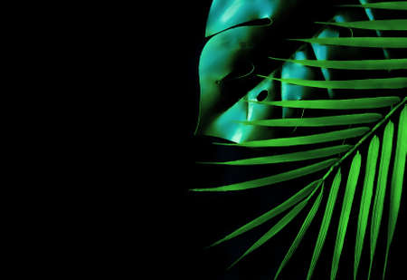 Mix of tropical leaves on green and black backgrounds. Place for text.
