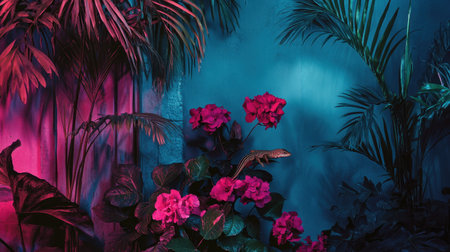 Experience a vibrant tropical scene featuring lush flowers and a subtle reptilian presence, enhanced by colorful lighting that creates a striking atmosphere.