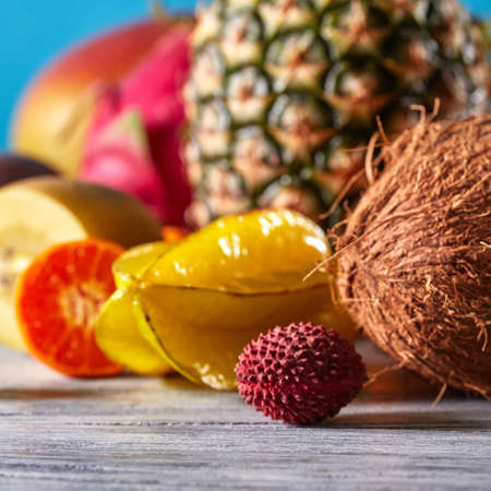 Close-up of tropical fruits - carambola, litchi, coconut, pineapple on a gray stone table.
