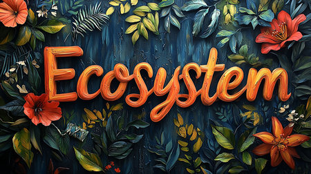 Colorful 'Ecosystem' text art surrounded by lush flowers and leaves, illustrating the beauty and diversity of natural environments. Ideal for environmental themes and nature-focused designs.