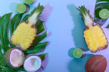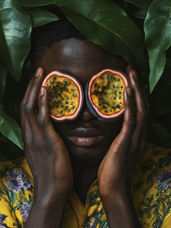 A vivid arrangement of fresh tropical fruits displayed in a colorful and artistic setting, evoking a lively tropical vibe.