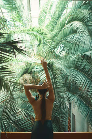 Back view fit exotic woman, bare back, watching huge palm tree leaves while resting on the balcony, arranging her hair, extending her hands up. Resort and vacations promotion. Beautiful life concept.
