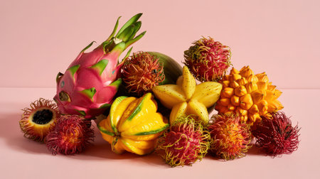 Vibrant tropical fruits like rambutan and dragon fruit displayed on a soft pink background.
