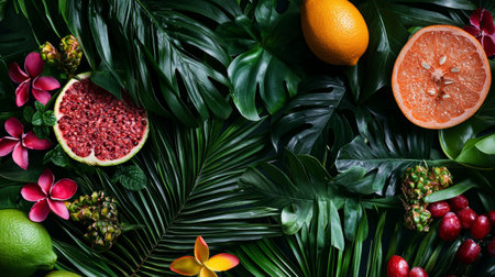 A colorful flat lay featuring tropical fruits like oranges and pomegranates surrounded by lush green leaves and flowers.