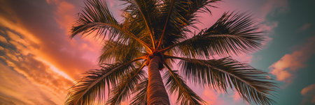 At dusk, tall palm trees create a striking silhouette against a vibrant sky filled with clouds, showingcasing shades of orange and purple near the ocean. The scene exudes tranquility and beauty.