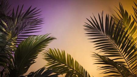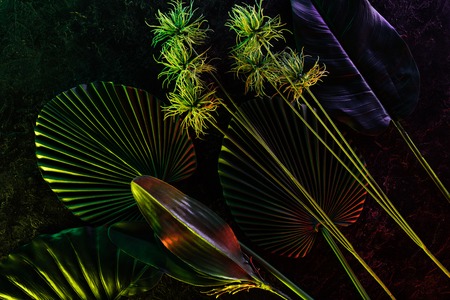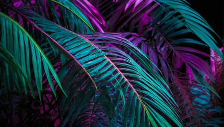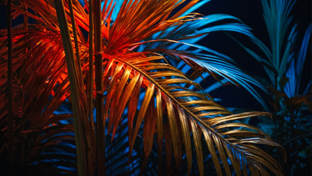 Dynamic closeup of tropical palm leaves with vivid red, yellow, and blue lighting. Nature meets art in an exotic spectacle, showcasing vibrant colors and lush foliage