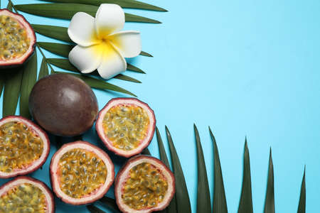 Passion fruits (maracuyas), flower and palm leaves on light blue background, flat lay. Space for text