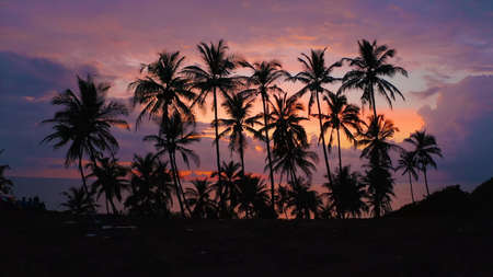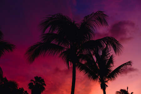 Palms on a beautiful sunset background creating a silhouette against the blue sky. Beautiful background landscape