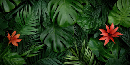 A stunning arrangement of lush green tropical leaves intertwined with vibrant red flowers creates a rich natural tapestry. Ideal for nature-themed projects.