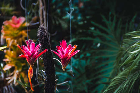 Air plant flowers hung with ropes in greenhouse. Copyspace. Selective focus.