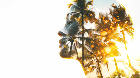 A double exposure image of a womans silhouette blended with palm trees and a beach at sunset.