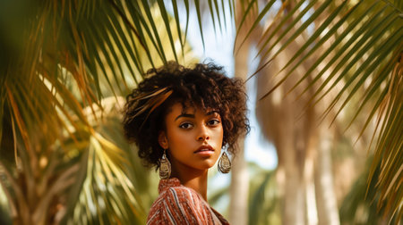 Beautiful african american woman in swimsuit posing under palm tree at sunset