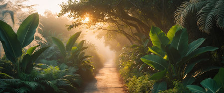AI Generated. Evening light illuminating a tranquil footpath surrounded by lush tropical plants and vibrant foliage in a serene natural setting
