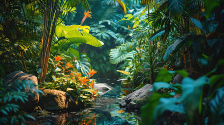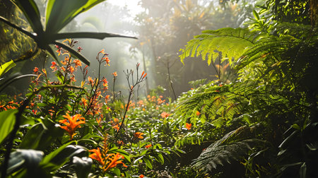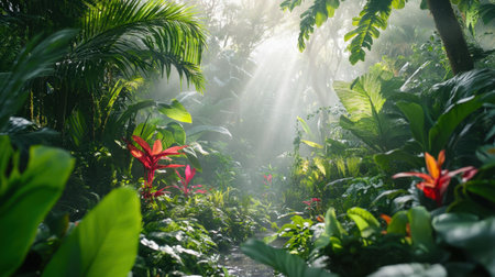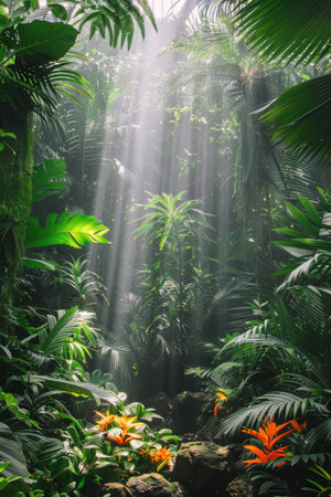 Explore a beautiful tropical jungle where sunlight streams through the dense canopy, illuminating vibrant green foliage and colorful flowers in a tranquil natural setting.
