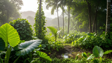 A lush tropical rainforest scene featuring giant green taro leaves in the foreground and tall palm trees rising into a misty canopy. Soft sunlight filters through the dense vegetation, creating a humid and verdant atmosphere typical of a deep jungle environment.